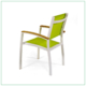 Sillón fabricado en estructura de aluminio recubierto con pintura anticorrosiva y malla de PVC “Textilene”; los descansa brazos tienen una aplicación de madera de teca. 100% para exterior.